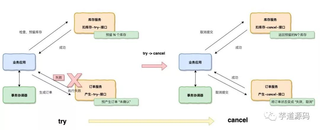 在try的时候,有任务一方为执行失败,则会执行cancel的接口操作,将在try阶段预留的资源进行释放。