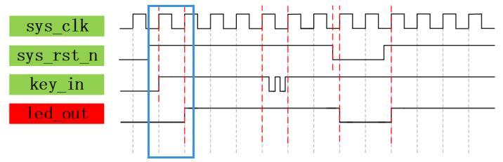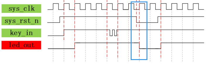 同步复位:sys_rst_n 被拉低后 led_out 没有立刻变为 0,而是当 syc_clk 的上升沿到来的时候 led_out 才复位成功