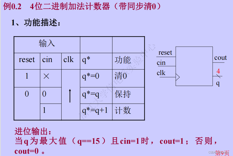 3.reset为0且cin为0时,遇到时钟上升沿时,q*=q,保持计数