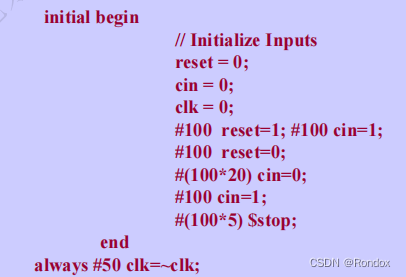 #100 reset=1; #100 cin=1; //#100 与第一行有关,这时候是100ns,延迟100ns后执行后面的语句