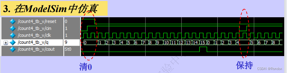 5.同步清0指的是 当4位达到最大值的时候(2进制的1111,也就是10进制的15),遇到上升沿之后并且再+1的情况下,会导致溢出此时溢出位cout变成1,此时遇到时钟上升沿的时候,q清0