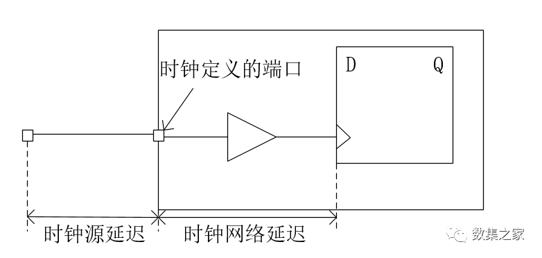 时钟信号从时钟源输出端到达时序单元时钟输入端是需要传播时间的。时钟延迟由时钟源点到达时钟定义的端口的延时(source latency)和时钟定义的端口到时序单元时钟输入端的延时(network latency)两部分组成,如下图所示。