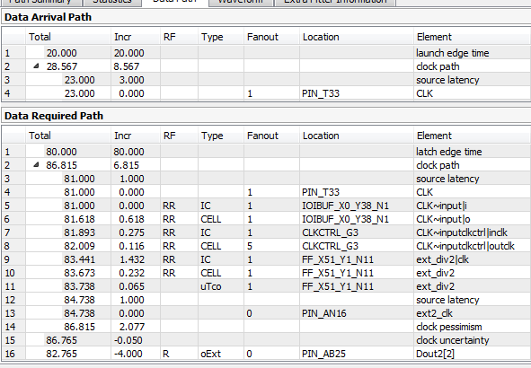 这个约束告诉我们每一个ddr_data端口都是被两个外部的寄存器驱动,一个是在ext_clk的上升沿锁存,另一个是在ext_clk的下降沿锁存,如果每没有在最后两行添加-add delay的话,最后两行就会把开始两行的约束覆盖掉,timequest也会报出警告。