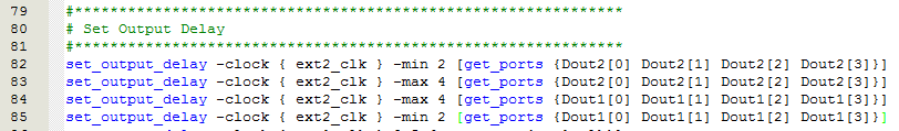 如图20,82到85行表示FPGA输出管脚Dout2[3:0]和Dout1[3:0]到时钟为ext2_clk的外部IC输入的最大延迟是4ns,最小延迟是2ns。