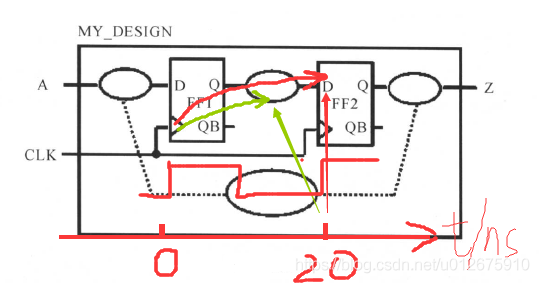 现在的节拍(0ns这一时刻)到来后,数据(比如说是一个高电平)从FF1的D端传来,经过组合逻辑,在下一个节拍(20ns这一时刻)的时候传到FF2的D端,更新FF2的数据(0ns时,FF2保存的是低电平),如红色箭头所示;但是由于延时太大,下一个节拍到来了(20ns到了),这个高电平还在还在组合逻辑那里,如绿色箭头所示,就导致了FF2的D端数据不能得到更新,或者不满足建立时间,由此可能引起锁存错误。当对时钟进行建模之后,拍长也就决定了,也就是那些延时(触发器的翻转时间/转换延时、寄存器与寄存器之间的组合逻辑延时、连线延时)最大是多少也就知道了,通过对时钟进行建模,也就是通过对寄存器与寄存之间的路径进行约束,DC就知道了这条路径运行的最大延时,就会选择合适的单元来满足这些延时的约束,如果DC选来选去,发现最牛逼的单元得到的电路延时还是很大,无法满足FF2的建立时间要求,DC就会报错。这个时候,你就要进行修改设计了(比如修改约束或者修改代码)。