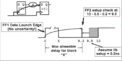 一般情况下,我们只约束建立时间,也就是只用第一种方式进行时钟偏差建模。当对建立时间偏差建模之后,这时,时钟周期、时钟偏差和建立时间的关系如下图所示:
