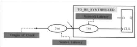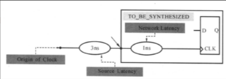 ④时钟的延时(latency) :时钟从时钟源(比如说晶振)出发到达触发器时钟端口的延时,称为时钟的延时,包含时钟源延迟(source latency)和时钟网络的延迟(network latency),如下图所示: