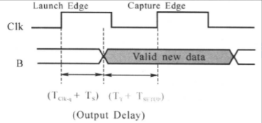 clk时钟上升沿通过内部电路的寄存器FF2发送数据经要综合的电路S,到达输出端口B,在下一个时钟的上升沿被到达外部寄存器的FF2接收。他们之间的时序关系如下图所示,我们要要约束的的组合路径电路S的延时,要DC计算它的延时是否能够满足时序关系,就要告诉DC外部输出的延时大概是多少: