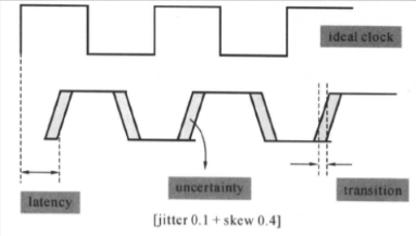 然而单单定义一个时钟周期进行约束寄存器与寄存器之间的路径很显然是过于理想的,需要再添加其他的时钟属性,在添加之前,需要知道时钟的偏移(skew)、抖动(jitter)、转换时间(transition)、延时(latency)这几个概念或者这几个时钟的属性: