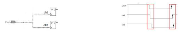 ①时钟的偏移(skew):时钟分支信号在到达寄存器的时钟端口过程中,都存在有线网等延时,由于延时,到达寄存器时钟端口的时钟信号存在有相位差,也就是不能保证每一个沿都对齐,这种差异称为时钟偏移(clock skew),也叫时钟偏斜。时钟的偏移如下图所示: