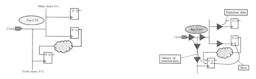 在默认的情况下,逻辑综合时,即使一个时钟要驱动很多寄存器,DC也不会在时钟的连线上加时钟缓冲器(clock buffer)以加强驱动能力,时钟输输入端直接连接到所有寄存器的时钟引脚,也就是说,对于高扇出(high fanout)的时钟连线,DC不会对它做设计规则的检查和优化,如下左图所示。在时钟连线上加上时钟缓冲器或作时钟树的综合(clock tree synthesis)一般由后端(back end)工具完成,后端工具根据整个设计的物理布局(placement)数据,进行时钟树的综合。加入时钟缓冲器后,使整个时钟树满足skew, latency和transition的目标。时钟树综合后的电路如下图所示: