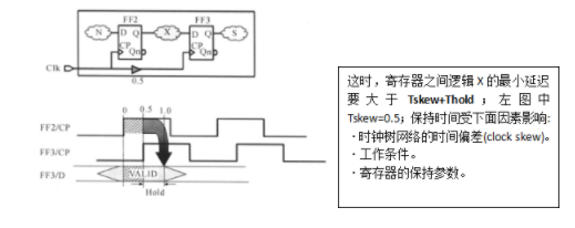 对于保持时间,在未考虑时钟偏移之前,前面说了,组合逻辑的延时要大于触发器的保持时间(具体原因参考前面的描述),当对时钟偏差建模之后,这时,时钟周期、时钟偏差和保持时间的时序关系如下所示: