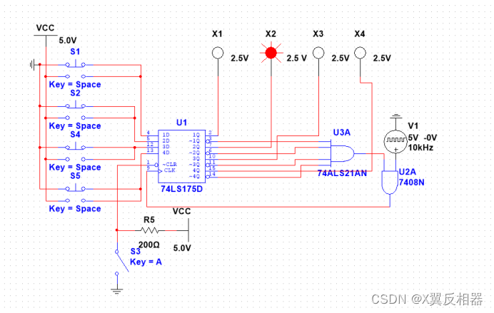 芯片选择74LS175,该芯片集成了四个D型触发器,为上升沿触发。四个触发器共用置零端,以及时钟信号端。