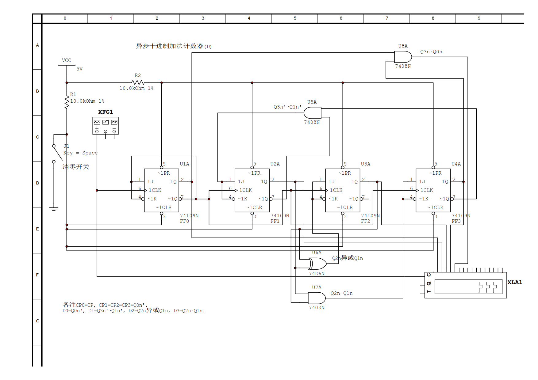 异步十进制加法计数器(D)(与之前设计的时钟方程不同)