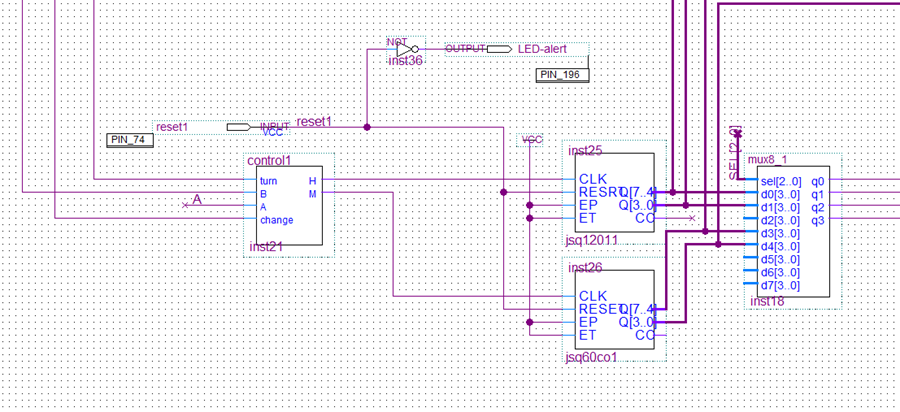 3.发现在手动校时模式下,change的脉冲信号加在计数器的clk端无用,分析电路后发现是由于计数器采用并行进位方式,在手动校时的模式下进位信号始终为0,即计数器并未使能,因此在进位端加了AB的约束条件,将进位信号与AB相或,以此保证在手动校时模式下计时器仍能使能。