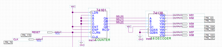 采用一片74161实现0 ~ 7,再经三—八译码器转换为扫描信号。数码管扫描部分,因为不需要第四第六位,所以没有接MS4、MS6