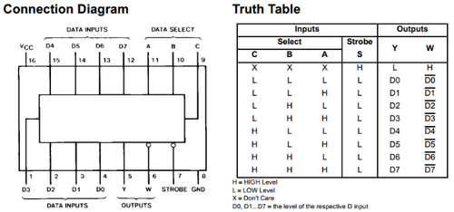 选择控制端(地址端)为C、B、A,按二进制译码,从8个输入数据D0~D7中,选择一个需要的数据送到输出端Y,S为使能端,低电平有效。