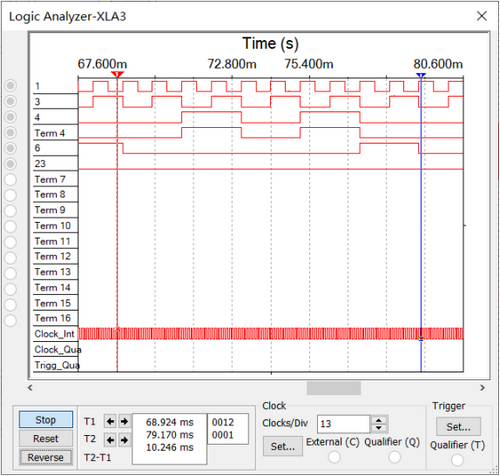 (4)数据测试,用逻辑分析仪观察并记录CLK、QA、QB、QC、QD、PCO的时序图
