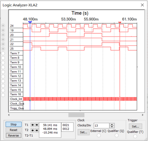①在CLK端加时钟信号,使用逻辑分析仪观察芯片CLK、QA、QB、QC、QD、Y的状态变化,并记录时序图。