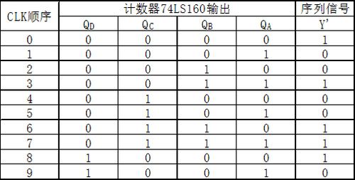分析:序列信号发生器的构成方法有多种。一种比较简单、直观的方法是用计数器和数据选择器构成。观察Y'的数据可知,序列位数为10,计数器仍然选择十进制计数器74LS160,再搭配一个8选1数据选择器(可选择74LS151)即可完成改接。