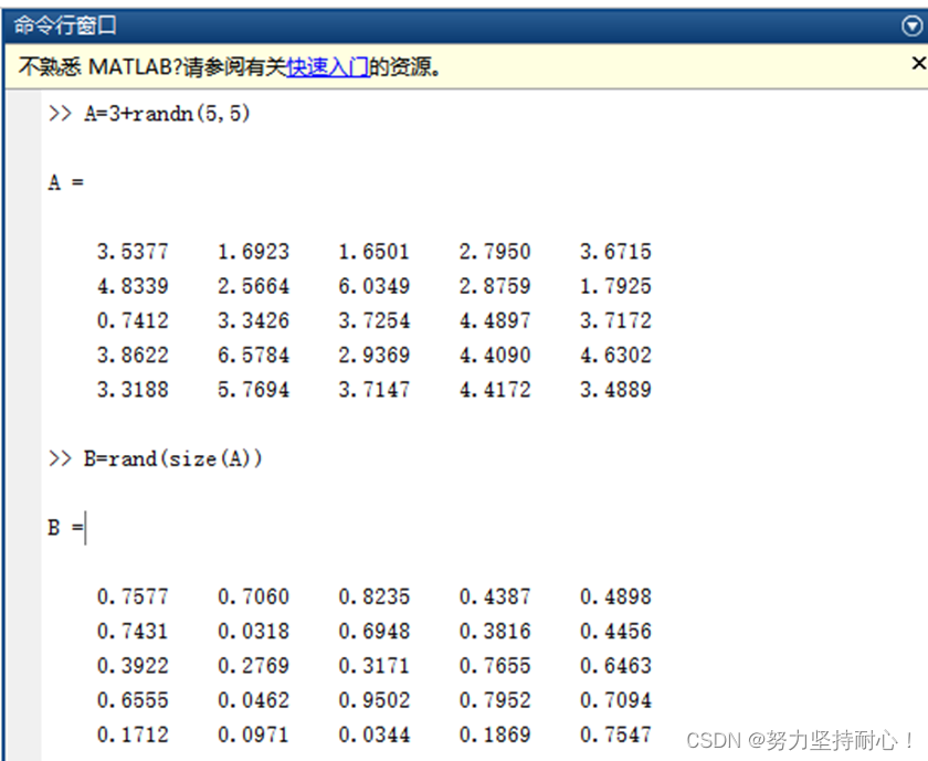- 产生均值为3,方差为1的5阶正态分布的随机方阵A,并产生和A有同样维数大小的随机数组B。