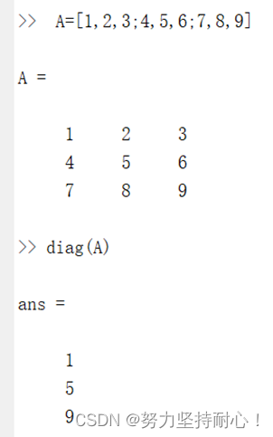 - 对于一个给定的矩阵A,diag(A),返回对角线元素的值