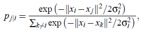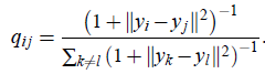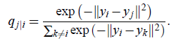 数据可视化一般将数据降维到低维空间,比如2D 3D空间。假设降维后数据点的高斯分布的方差为1/sqrt(2),则数据点yj与yi的相似度,也就是条件概率为: