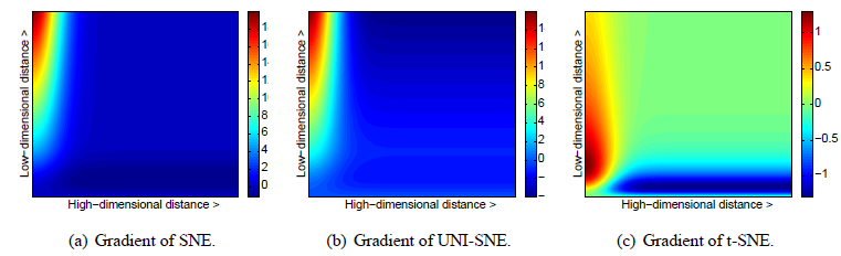 这个图展示的是,高维数据点对儿和低维数据点对儿之间的距离大小与对应梯度的关系,从a和b中可以看出,t-SNE不倾向于用两个近的点表示两个不相似的点,然而这种不倾向并没有太强烈。总之,(1)t-SNE通过大的数据对儿距离的均值来建模不相似的两个点,(2)通过小的距离建模小的数据对儿。另外,使用t分布也使得梯度计算更简单: