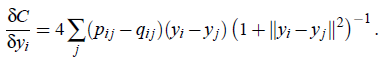 最优解就是降维后的数据点yi,优化开始时这些点初始化为各向同性的高斯随机数,方差很小,均值为0。为了加快优化并防止陷入局部最优解,使用带动量的梯度下降,也就是说,当前梯度加上之前所有梯度的指数衰减,可以想象指数曲线或者是卷积和之类的,为什么是所有梯度的指数衰减?因为