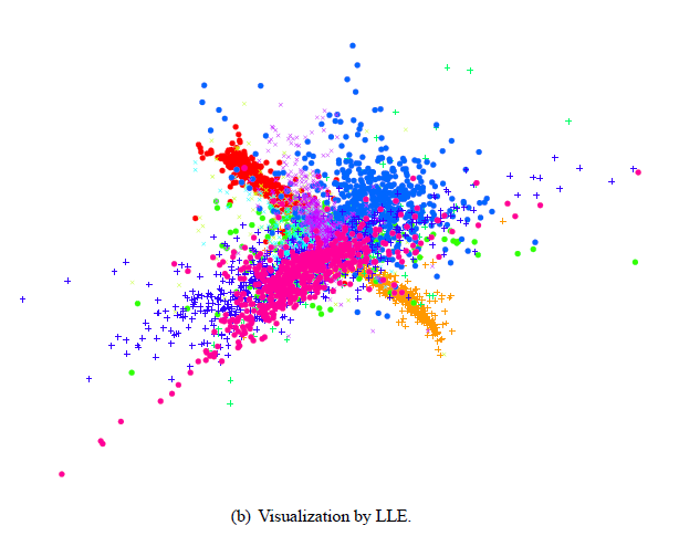 很小)造成的损失却很小(例如,0.02*log(0.02/0.8)=-0.03),这个小的损失就源于降维后的空间的概率密度(也就是0.02)。KL损失函数这样的特性,就使得SNE具有保留原数据空间局部结构的特性(什么意思呢?意思就是,如果你用两个很近的点来表示原来距离很远的点,这样的损失很大,那么降维后的分布就倾向于用距离很的点来表示原来就很近的点,用很远的点来表示原来就很远的点,当然,用很近的点表示原来很远的点的损失也不大,但是多少也会有。哪儿的损失大,最优化时就更关注哪儿,因此,SNE就更关注于原数据的局部结构。其实这里的逻辑是有问题的,它带来的后果是,不同类之间的距离也会越来越近,因为只要用很近的点来表示无论远近的点,损失都很小!这也是t-SNE要解决的问题之一。)
