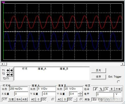 在电路图的演示中,双击示波器的图标,再打开仿真开关,就能看到电路的输入、输出信号波形,如下图所示。观察图片能够发现,输出信号和输入信号基本上是反相的,同时电路的放大倍数约为50,这说明电路工作在谐振放大状态。