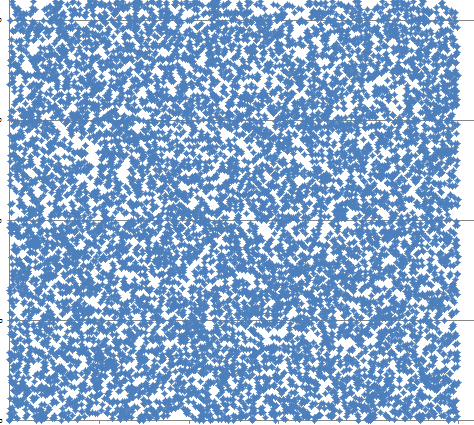 统计运算太麻烦了,直观上图。反正这图我没有发现明显的规律。因此这种伪随机数在一定条件下是可以满足随机性性质的。而以前我取a=5,b=1时有部分点在一条斜线上分布,这就不满足咯。
