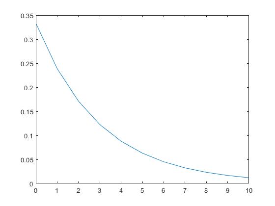 λ=1/3(期望为3)的指数分布概率密度分布函数图形如下: