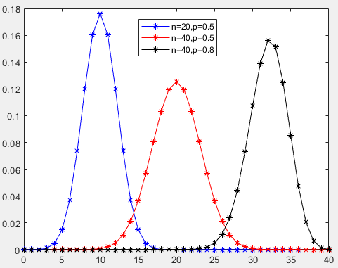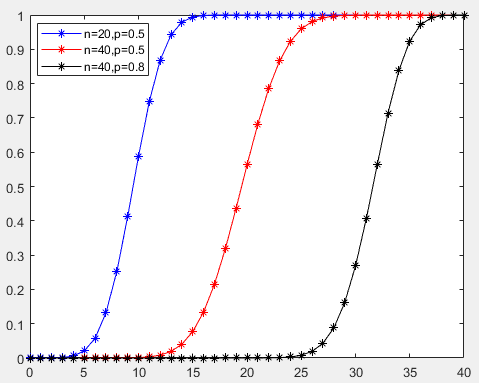 legend('n=20,p=0.5','n=40,p=0.5','n=40,p=0.8')