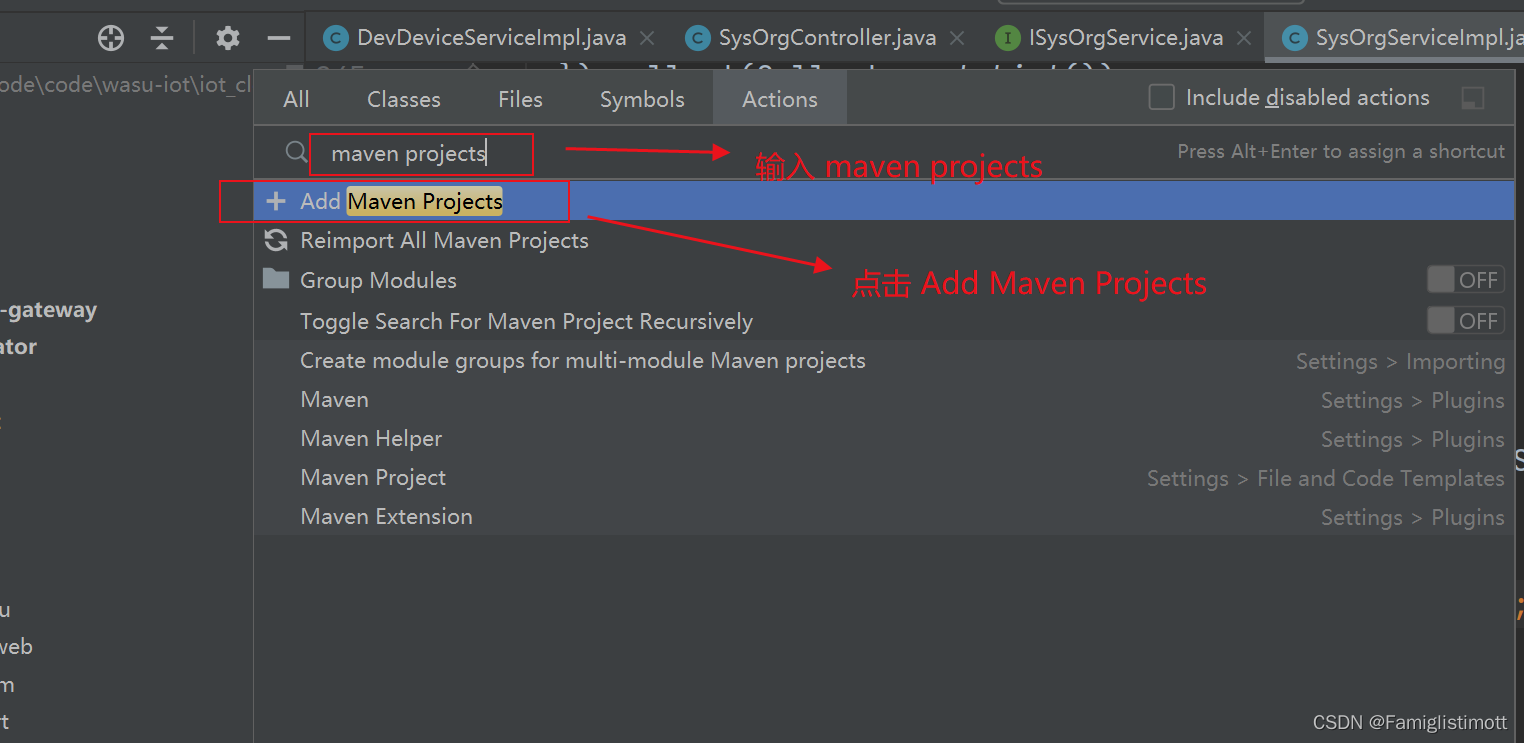 2、接着在输入框中输入 maven projects ,会弹出一个 Add Maven Projects 选项,点击即可,会弹出下图的弹窗。