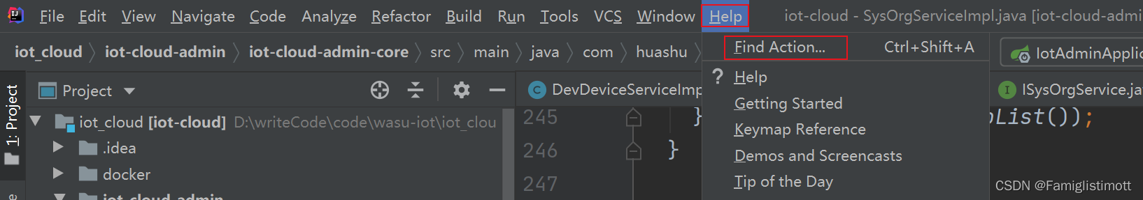 1、首先点击工具栏最左边的 Help 再点击 Find Action ;或者使用快捷键 Ctrl+Shift+A