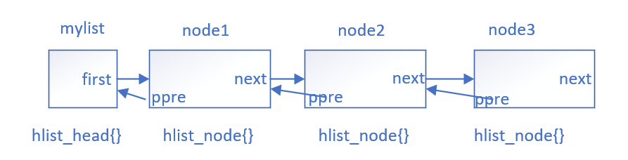 整个哈希表结构如下图所示,其中ppre是个二级指针,它指向前一个节点的第一个指针变量,例如node1的ppre指向mylist的first指针,node2的ppre指向node1的next指针。