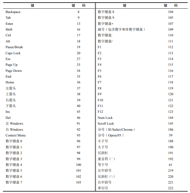 浏览器在 event 对象上支持 charCode 属性,只有发生 keypress 事件时这个属性才会被设置值,包含的是按键字符对应的 ASCII 编码。通常,charCode 属性的值是 0,在 keypress 事件发生时则是 对应按键的键码。IE8 及更早版本和 Opera 使用 keyCode 传达字符的 ASCII 编码