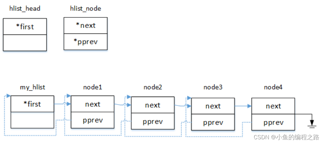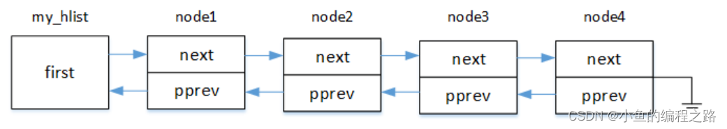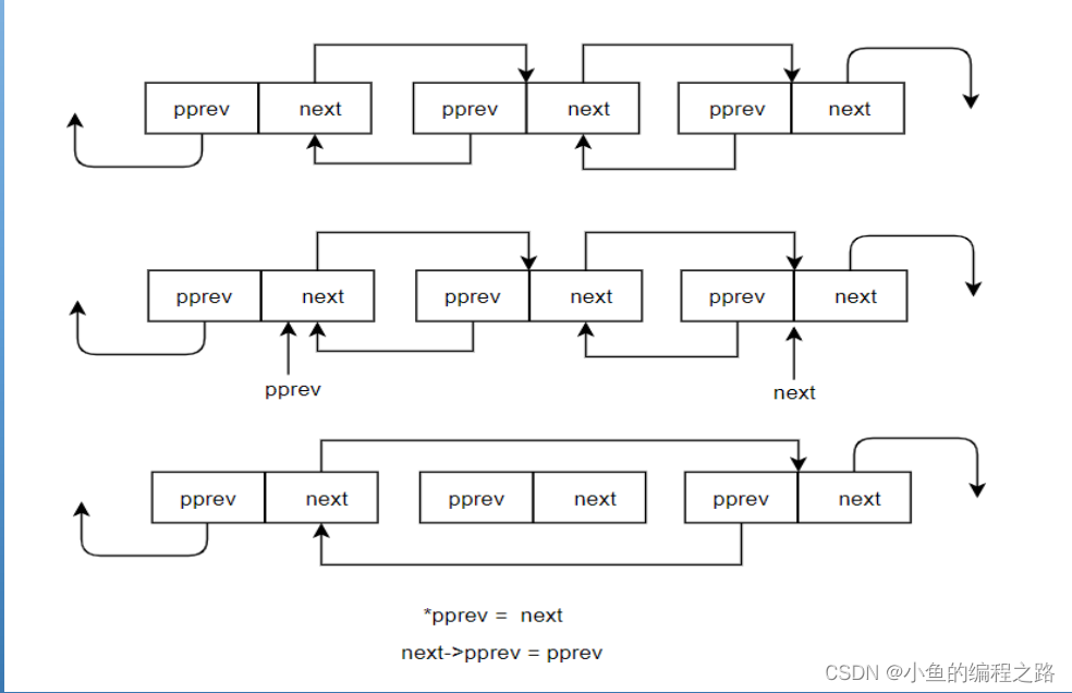 为了间接改变表头中hlist_node类型first指针的值,使用了二级指针,因此在node节点中pprev中保存的为前一个结点中第一个元素的地址,头结点中即为first指针,其余节点则为next。