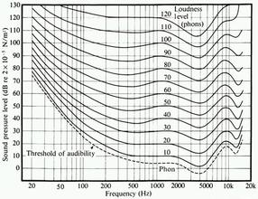 人耳对响度的感觉随声压级变化。声压级低时,分辨率差;声压级高,分辨率提高。声压级在50dB以上,人耳的声压、响度变化最小,大约1dB。 小于40 dB时,声压级要1~3dB以上才觉察出来。一个乐队演奏时,假如低、高音都以100 dB的声压级录音,此时等响线曲差不多平直,低高音听起来有差不多的响度。如果重放时声压级较低,假如50dB,这时50Hz的低音刚能听到,而1000Hz的声音却有50dB,高音也同时听上去很弱,结果原有的音色都改变了。这时要想让50Hz的声音听起来与1000Hz的声音有大致相同的响度,必须将其提升20 dB左右。因此声音以低于原始声(录音时)的声压级重放,必须通过均衡器(Equalizer)来提升低音和高音以保持原有音色平衡。