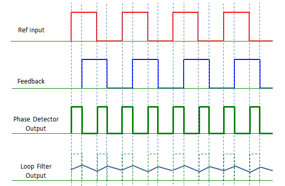 因此,锁相环的进一步发展将是开发一种相位检测器,根据反馈信号相位与参考信号相位相比是超前还是滞后,给出不同的结果。在该图中,您可以看到鉴相器根据相位是超前的还是滞后的产生不同极性(不同的符号)的输出信号。