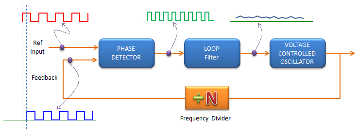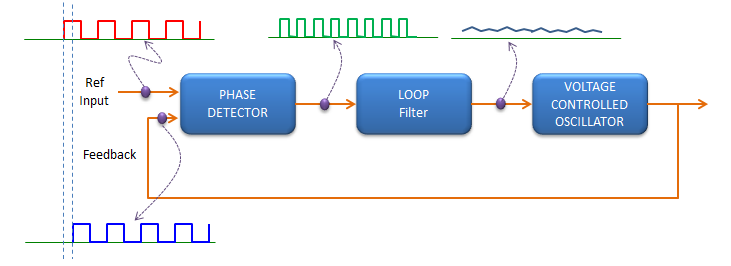 PLL代表相位锁定环。顾名思义,如下图所示,PLL是一种具有反馈循环的电路,可将反馈信号的相/频率保持与参考输入信号的相/频率相同(锁定)。
