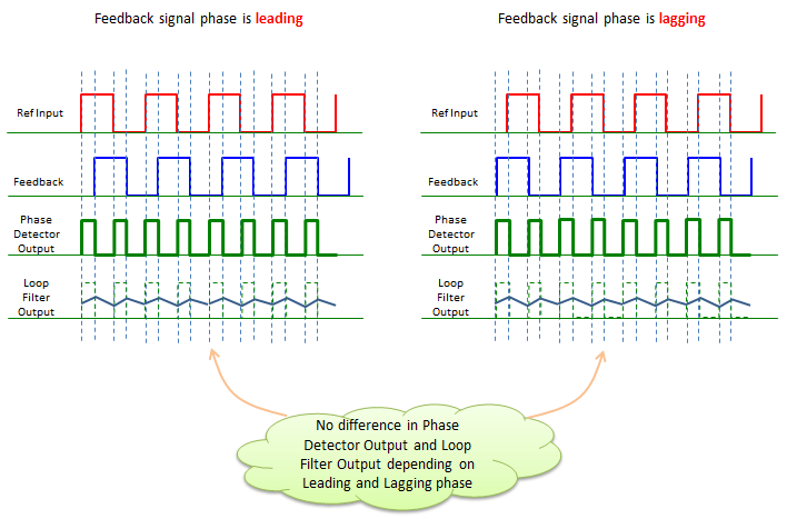 看起来没那么复杂。但是如上所述,锁相环存在一个问题。如果你简单地应用上面解释的规则,相检波器不能使反馈信号相位与参考信号相位相比是领先的还是滞后的有任何区别,如下所示。