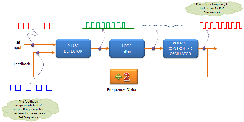 例如,如果在反馈路径上放置’2’分频器,则可以将频率锁定为Ref Input frequency频率的两倍