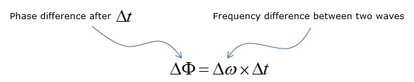 下面的方程表明两个信号之间的相位差(从相同的相位开始)在一定的时间跨度后。
