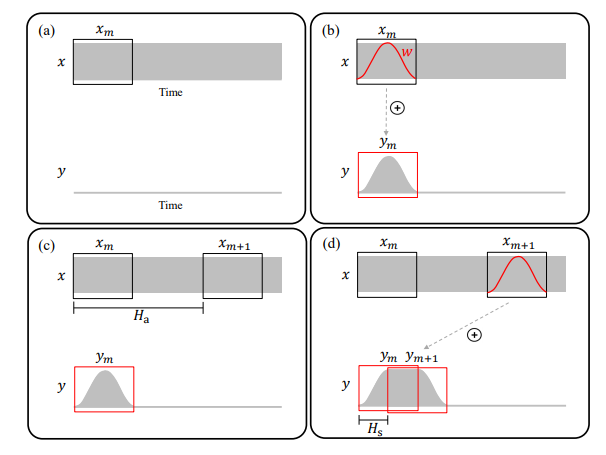 如图 2 所示,x 为输入信号、y 为输出信号。OLA 的过程按照图 2 中 b、c、d 的顺序:取一帧 xm,选择间隔长度 Ha 的下一帧 xm+1,然后把这两帧加窗(汉宁窗)后,以步长 Hs 把两帧重叠、相加在一起。很显然 Ha 和 Hs 的比值就是原始信号和输出信号长度的比值。这样就可以把原始音频拼接成不同长度的音频了,然后再经过重采样把音频恢复成和原始音频相同长度的音频再播放,这样就实现了变速不变调。