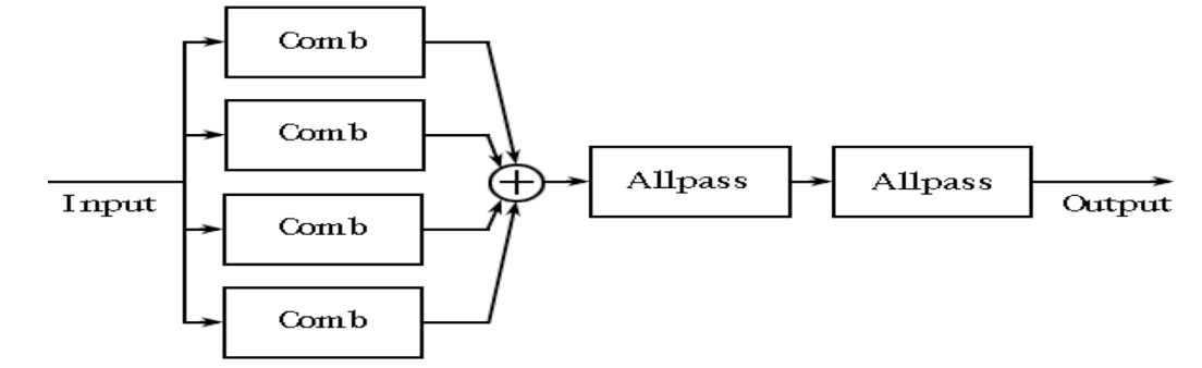 图 7 为 Schroeder 混响模型的结构图,其中每个 Comb 代表一个梳状滤波器。但 Schroeder 依靠全通滤波器生成的混响依旧不够密集。