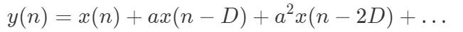 简单地理解,混响信号可以看作是直达声和许多逐步衰减、不断延迟的回声信号叠加而成的。假设一个衰减系数 a 和延迟 D,那么混响信号 y(n) 可以用下面的等比数列来表示: