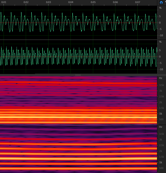 再看看频域信号(红色部分)是不是变得更稀疏了?最下面的那根亮线代表的基频从 250Hz 左右提升到了大约 500Hz 的位置。由于谐波的频率是基频的倍数,所以谐波之间的间隔也变大了。