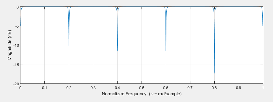 其中 x(n) 是输入信号,D 为回声的延迟。而这种形式正是梳状滤波器的形式。如图 6 所示,所谓梳状滤波器,其实就是因为它的频率响应呈一个梳子的形状。梳状滤波常被用来消除某些不需要的谐波,但这里主要是利用了它的拖尾效应。